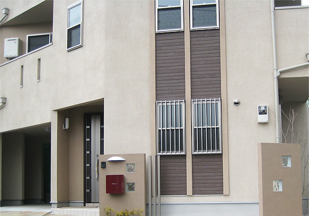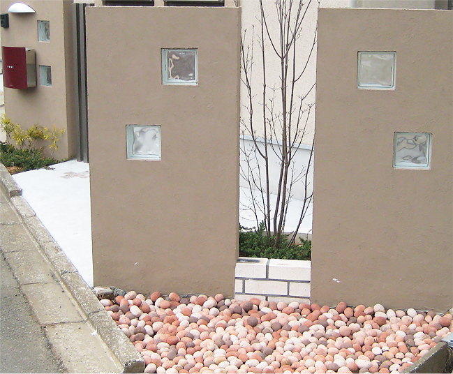 ベージュの門柱にガラスブロックを埋め込み、アクセントとしてボルドーカラーのポスト。家の雰囲気に合わせて、シンプルモダンに仕上げました。