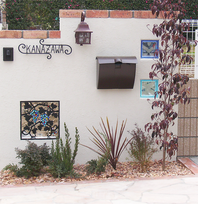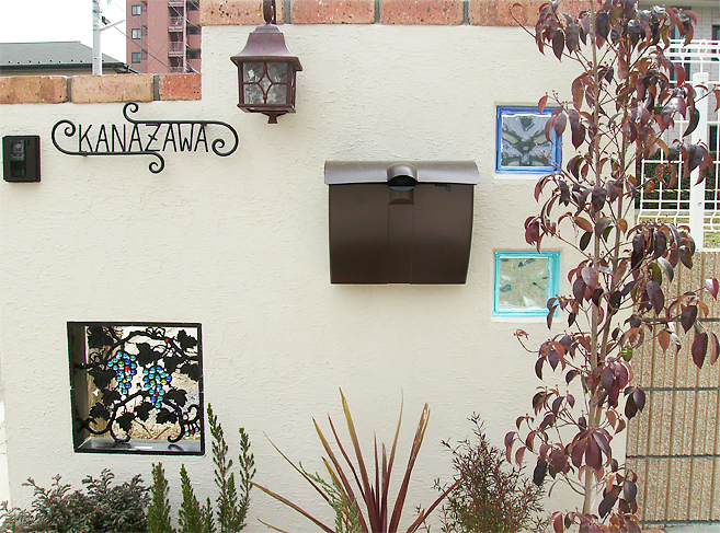 エントランスの門柱にガラスと金属が一体になった高級感のあるシャインピクチャーを埋め込みました。植物をモチーフとした美しいデザイン。絵柄のバリエーションは9パターンあり。ブルーのガラスブロックとマッチしています。