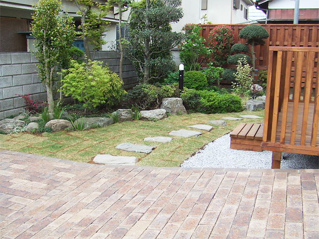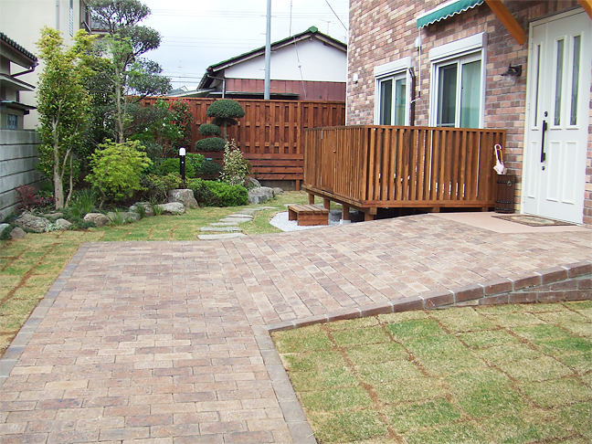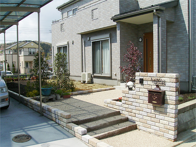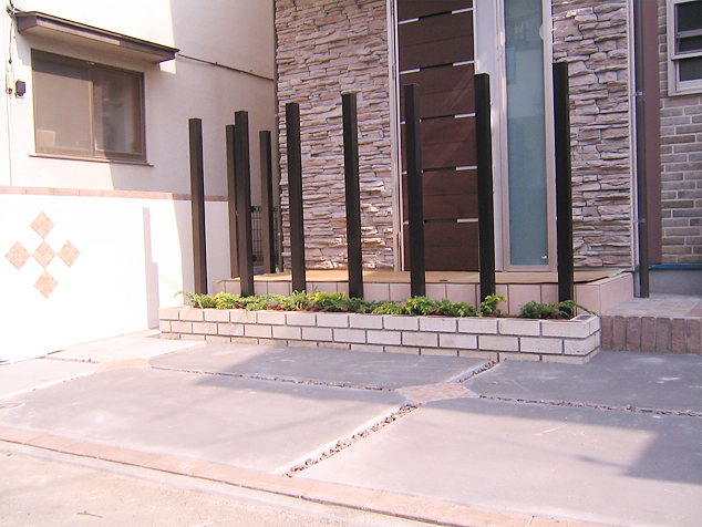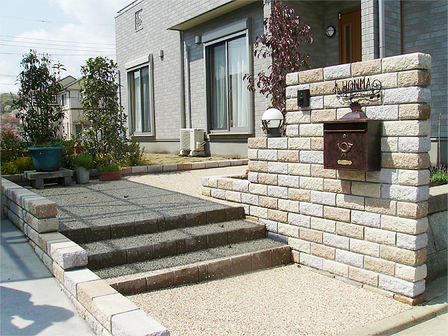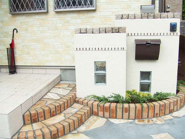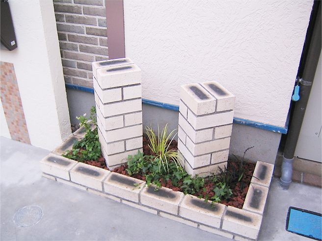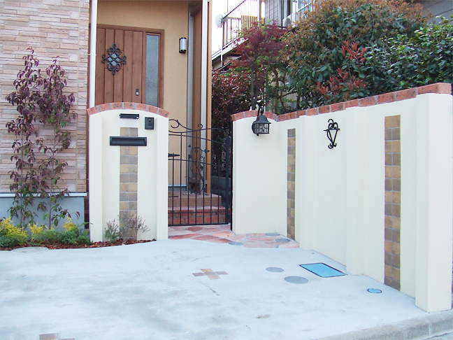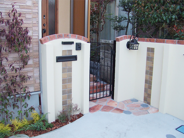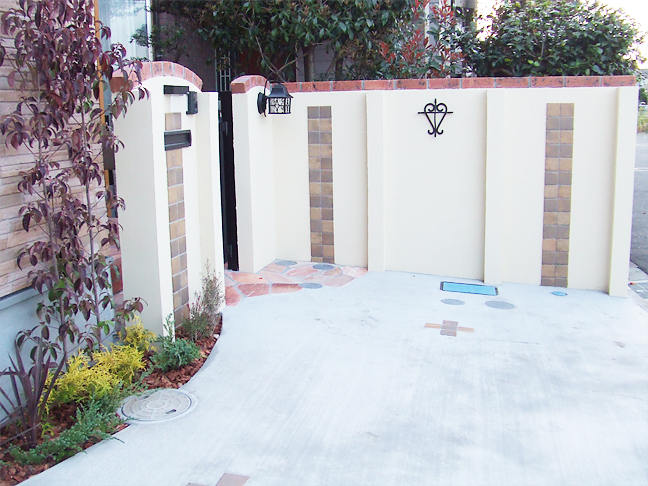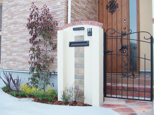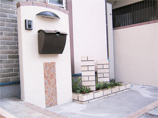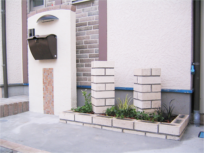 アイボリーカラーの門柱にアクセントとしてお洒落なモザイクタイルをはめ込みました。 脇には明るいカラーのオーストラリアレンガ、ヌーディ クレボーレを重ねて花台に。