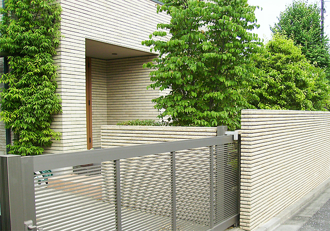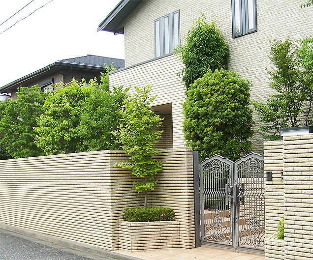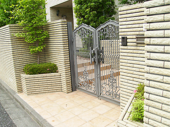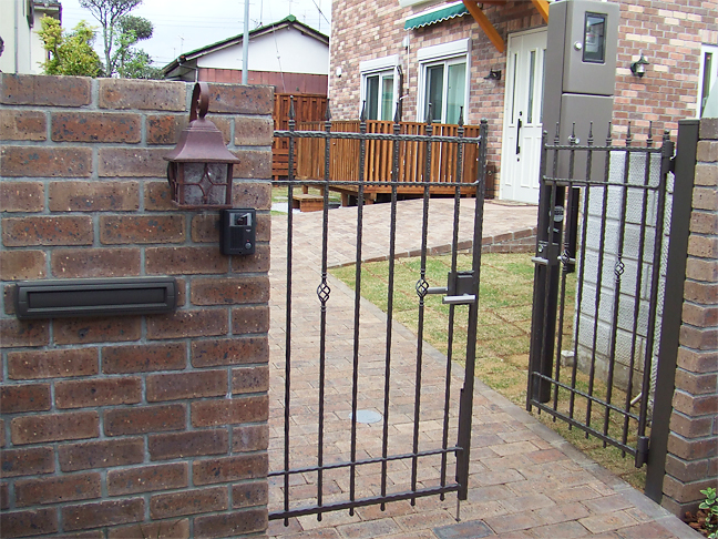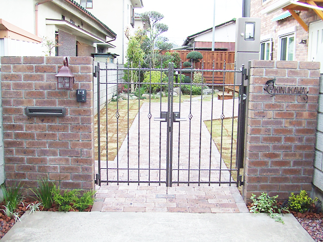 門柱は焼きムラが多彩な表情を見せるオーストラリアレンガ(ジェラルブリック 色:シルバー)を重ねました。アイアンの門扉との組み合わせでヨーロピアンスタイルに。