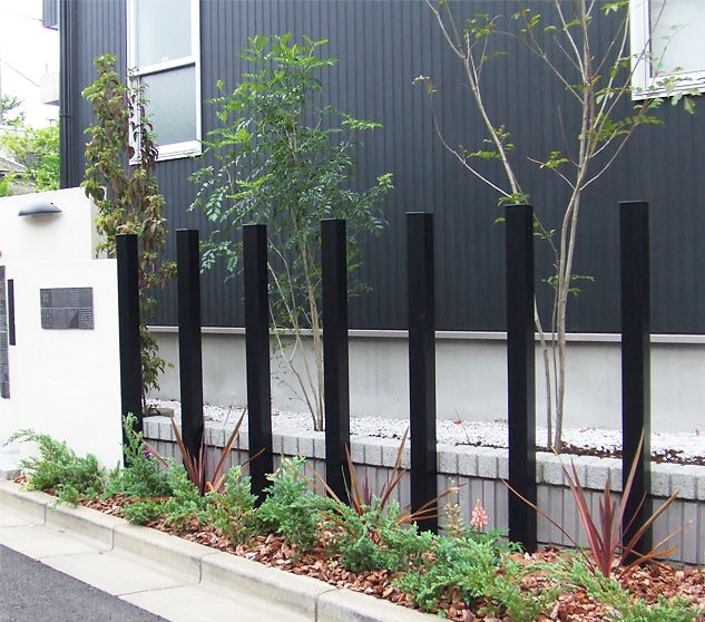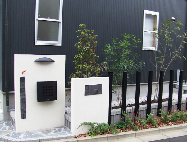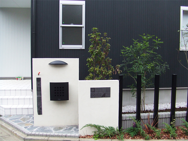アイボリーの門柱にドイツ製のブラックのポスト、モザイクタイルをアクセントとして貼りました。家のサイディングに合わせて黒いアルミの角柱を立て、全体をシンプルモダンに。