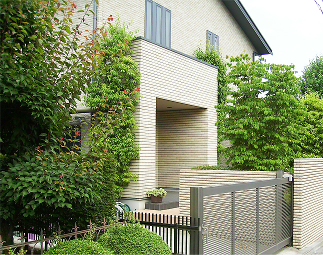 アイボリーの門柱にアクセントとしてブラウン系のタイルを埋め込み、上にはやわらかで素朴な質感のオーストラリアレンガをのせました。