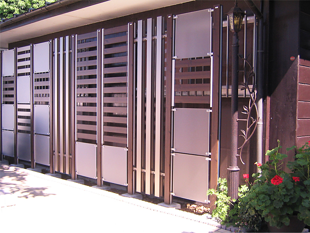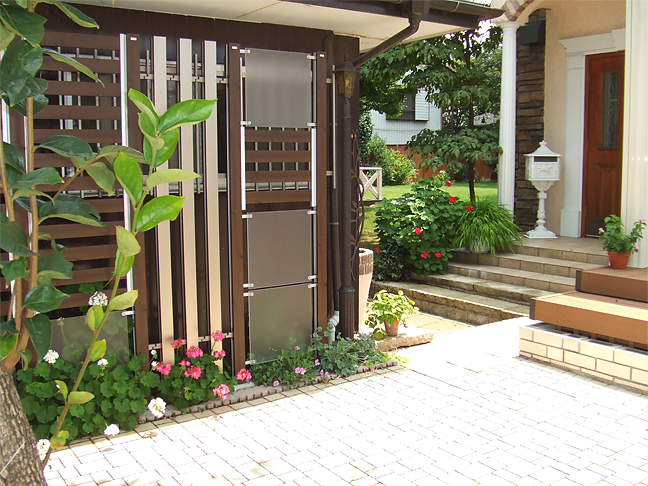 この美しいデザインのパーティションは、三協立山アルミの「アクセンティア」です。シンプルモダン住宅に、自在な組み合わせで直線にも曲線にもフィットし、個性的なデザインでファサードを演出します。色は5色あり、アクリルパネルは3色から選べます。展示場にありますので、是非見に来てください。