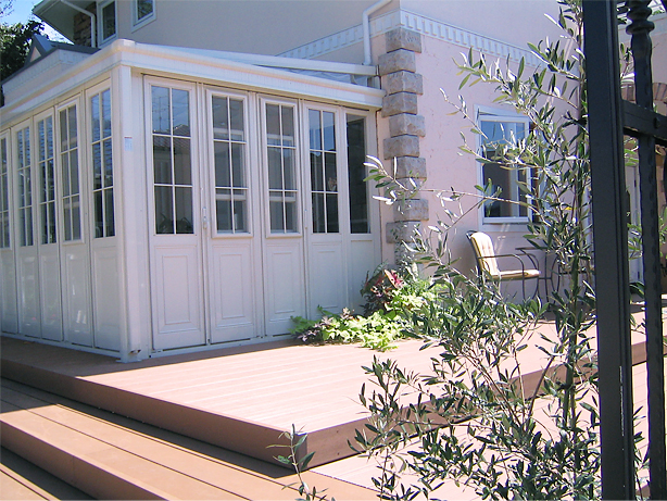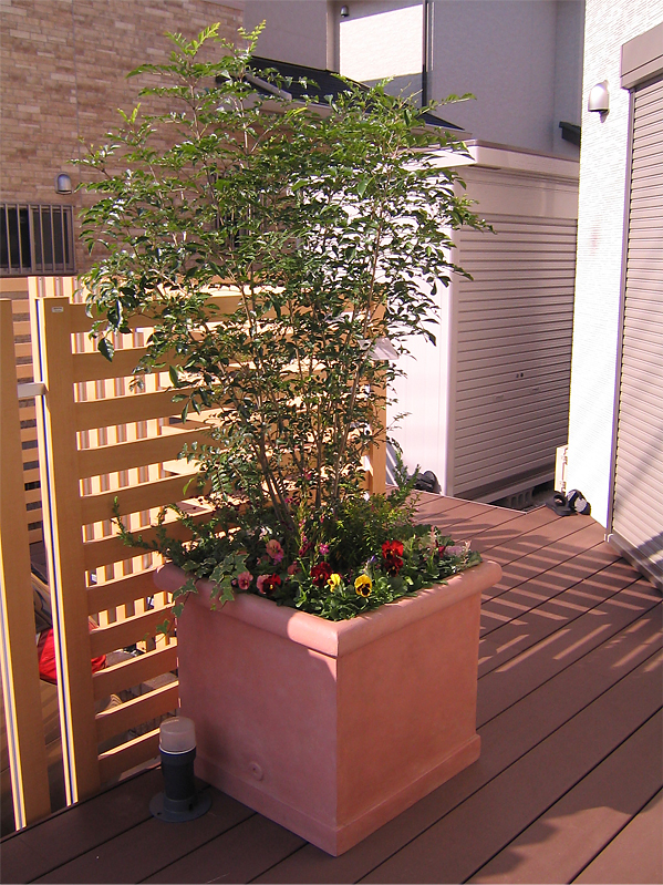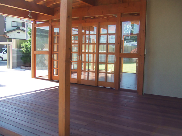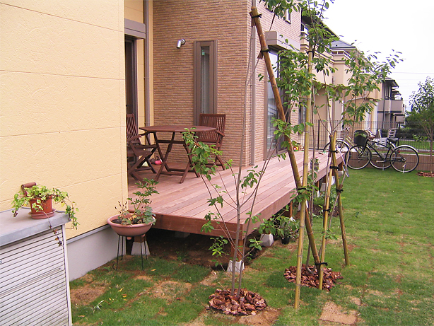 リビングから外でお茶ができるようにウッドデッキを広く作りました。耐久性や強度に優れたイペ材を使用し、美しい仕上がりになりました。樹木の成長も楽しみです。