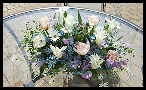 通勤中の車の中でラジオの花粉情報を聴いていたら、「今日もたくさん花粉が飛んでいます」 とのこと。今年は本当に花粉の量が多いようで花粉症の人にとっては辛い季節ですね。 他人事のように言っておりますが私も実は花粉症。でも今年はとっても楽なのです。漢方が花粉に効く!と聞いたので今年は試してみました。2月頃から飲み始めて約2か月になりますが、自分が花粉症であるというのを忘れるほどなのです。漢方を処方してくれる病院で出してもらえるので、今まで何をやってもダメだったという方は試してみる価値あるかも。ただ体質は人それぞれなので、絶対効く!とは言えませんが。それと花粉が飛び始める前から飲んだ方がいいみたいですね。 今回の写真は直子さんが作った清楚な雰囲気のフラワーアレンジメントです。ある催しの会場に飾る為に作ったものですが、とってもよいお天気だったので太陽の下で撮影しました。チューリップやマーガレットやスィートピーなど、春らしい花です。
