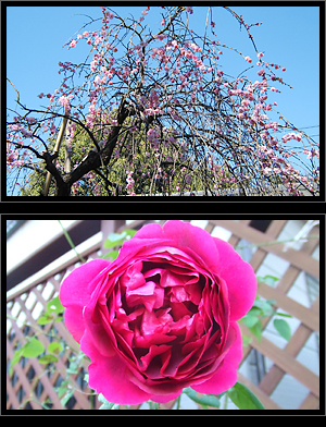 少し前に撮った写真ですが、しだれ梅と「ダークレディ」という名のイングリッシュローズです。