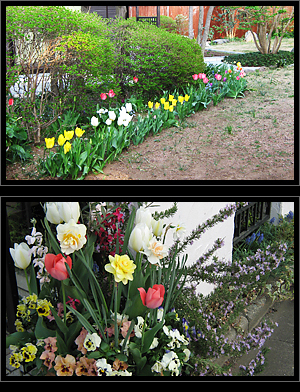 住宅街を歩いていると色々な種類の花が目に留まり、思わず「春だな~」と呟いてしまいます。ガーデンショップやホームセンターにある色とりどりの花を見るとついつい欲しくなってしまいますが、今は自分の狭いベランダに入る余地がないので我慢、我慢。パンジーの花が終わったら新しい花を買って寄せ植えをしようかと思案中。今は外で咲いている花たちを見て楽しみます。お庭に植えている花やコンテナの寄せ植えからも家の人それぞれの個性が出ていますね。 最近の日本の夏は猛暑が多いので、今が一番人にとっても植物にとっても良い季節なのかもしれません。今年もまたあの暑さ!になるのかと思うとちょっと今から気が重い。暑さ対策、今年はどうしよう…。毎年温暖化の影響をひしひしと感じます。昨日もテレビで北極の氷が年々減ってきたと言っていたし。世界中が地球環境を考える時代になってきました。今回は可愛らしいピンクのチューリップが花開いたカラフルな寄せ植えです。